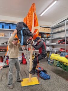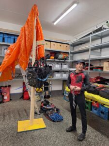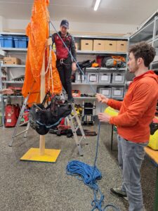 Schritt für Schritt demonstrierte uns Tom, mit welchen Hilfsmitteln und Werkzeugen die Bergretter Piloten nach einer Baumlandung aus ihrer Notlage befreien. Dabei war es auch wertvoll zu erfahren, wie man sich selbst bis zum Eintreffen der Helfer verhalten sollte und wie man den Bergrettern dann ihre Arbeit erleichtern könnte.