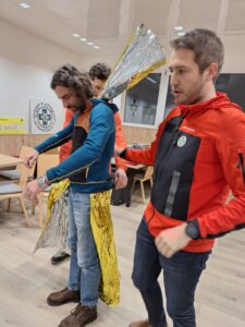 Doch wir waren nicht nur zum Zuhören und Zusehen da. Ganz im Sinne von learning by doing durfte jeder selbst Hand anlegen, und seine Vereinskollegen mit der Israeli-Bandage und der Rettungsdecke “verarzten”. Unglaublich, wie man mit wenigen Handgriffen und nur diesen beiden Hilfsmitteln verschiedenste Verletzungen erstversorgen kann.